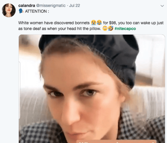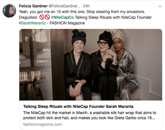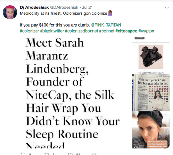 Yes, the same night cap black women have been wrapping their hair in for generations is a new invention. This claim led to a huge backlash on Twitter as you can see below:-